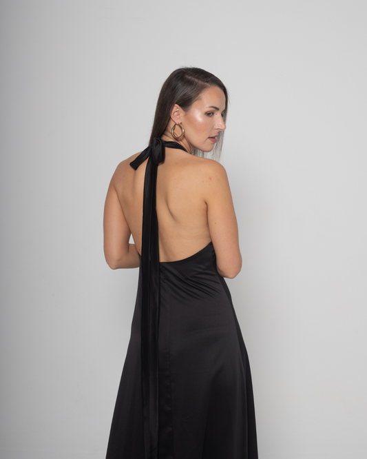 Satin Low Back Halterneck Dress | Black