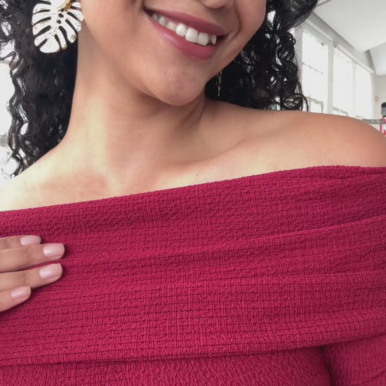 Look and feel effortlessly elegant in our beautifully made Textured Off-the-Shoulder Top. Designed in a rich berry and milk hue, this long-sleeve silhouette brings a modern twist to timeless femininity. The softly draped neckline highlights the décolletage, while the subtly textured knit fabric adds dimension and sophistication. With a gently figure-hugging shape and just the right amount of stretch, this piece is as flattering as it is comfortable. For a more relaxed fit, we recommend sizing up.