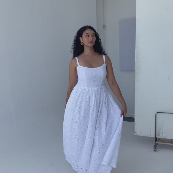 Effortless elegance meets timeless charm in The Harris Dress. Made from breathable 100% Cotton Anglaise with a soft 100% Cotton Voile lining, this crisp white beauty is designed for dreamy days and enchanting evenings.