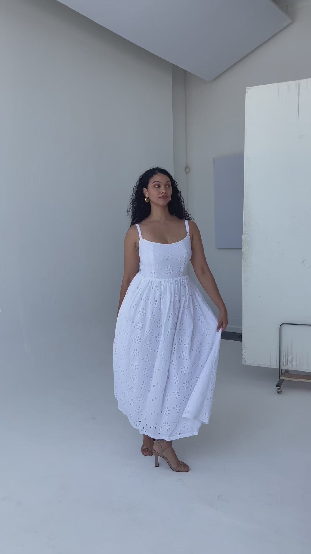 A slightly scooped neckline and adjustable straps offer a flattering, customisable fit, while the full midi skirt, gathered at the waist, creates a whimsical, romantic silhouette. Thoughtful gold details add a touch of luxe, and the side seam closure ensures a seamless finish.